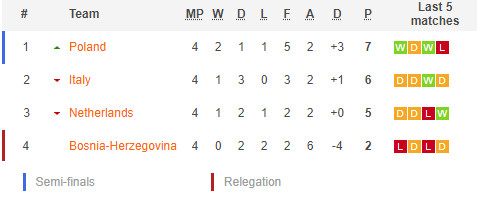 คู่นี้ถือเป็นคู่แข่งโดยตรงในการแย่งหัวตาราง อิตาลีผลงานดีช่วงหลัง 5 เกมล่าสุดชนะ 3 เสมอ 2 นัดที่แล้วเพิ่งถล่มยับเอสโตเนีย อย่างไรก็ตามโปแลนด์มาตรฐานสูงกว่าคู่แข่งของเจ้าบ้านนัดที่แล้วเยอะ ฟอร์มการเล่นก็เฉียบขาดไม่แพ้กัน สองเกมล่าสุดเจอทีมแข็งๆก็เอาชนะได้หมดและชนะแบบสกอร์ขาดอีกต่างหาก เกมรับก็ยอดเยี่ยมไม่เสียประตูมา 3 เกม นัดนี้เล่นบ้านอิตาลีก็จริงแต่ต่อแพงแบบนี้ตามไม่ลงรองโปแลนด์ดีกว่า