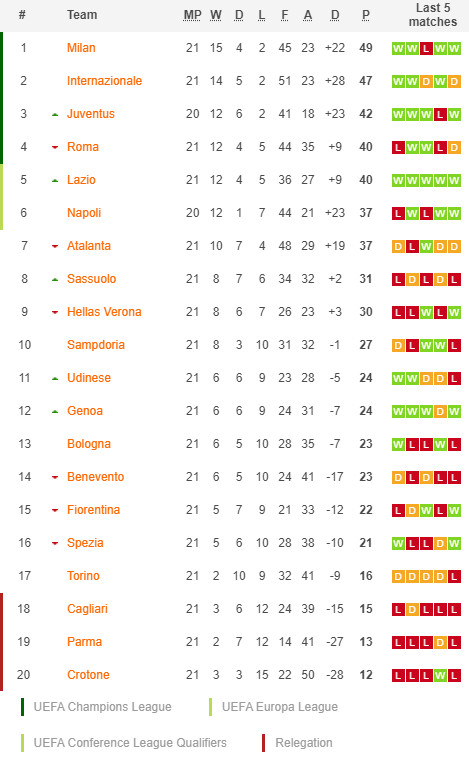 31/01/21 แพ้ อินเตอร์ มิลาน 0-4 (เยือน) เซเรีย อา / รอง 2 ... เสีย