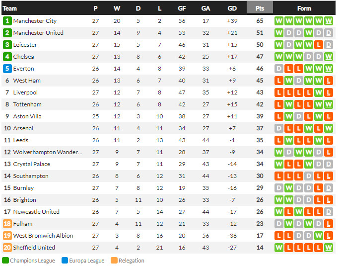 06/02/21 ชนะ อาร์เซน่อล 1-0 (เหย้า) พรีเมียร์ลีก / เสมอ ... ได้