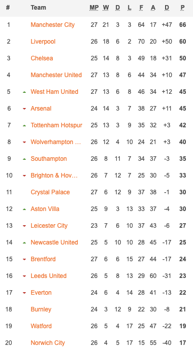 11/02/22 แพ้ ลิเวอร์พูล 0-2 (เยือน) พรีเมียร์ลีก / รอง 2...เจ๊า