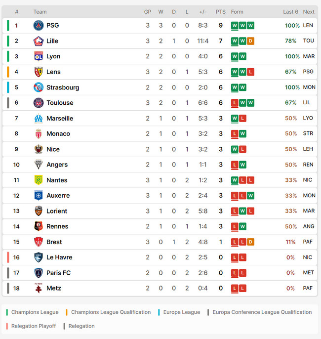 17/08/25 แพ้ โมนาโก 1-3 (เยือน) ลีก เอิง / รอง 2 ... เสมอ