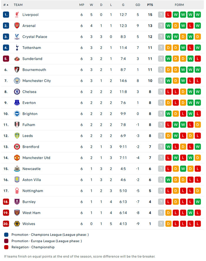 ฟอร์ม 6 นัดหลังสุดในลีก