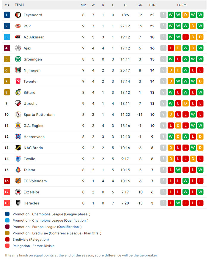 28/09/25 ชนะ สปาร์ต้า ร็อตเตอร์ดัม 3-0 (เหย้า) พรีเมียร์ดัตช์ / เสมอ ... ได้