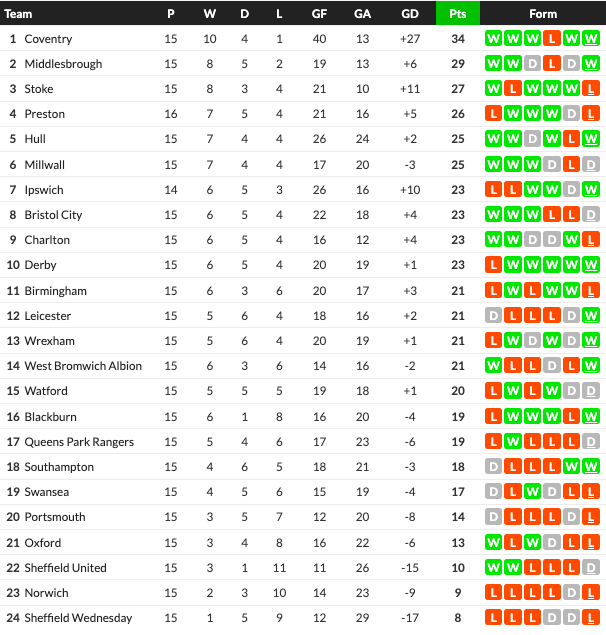 05/11/25 แพ้ โคเวนทรี่ 1-3 (เยือน) แชมเปี้ยนชิพ / รอง 0.75 ... เสีย