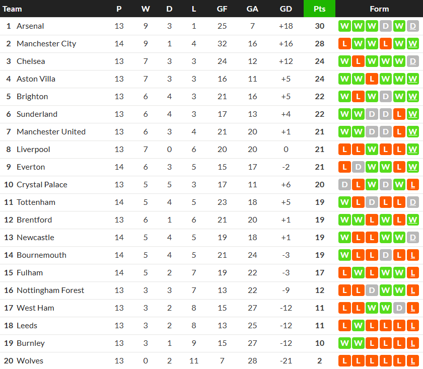 30/11/25 แพ้ ลิเวอร์พูล 0-2 (เหย้า) พรีเมียร์ลีก / รอง 1 ... เสีย