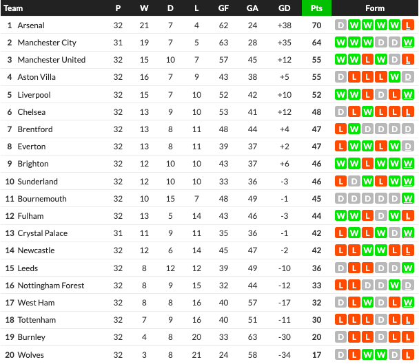11/04/26 แพ้ ไบรท์ตันฯ 0-2 (เหย้า) พรีเมียร์ลีก / รอง 1 ... เสีย